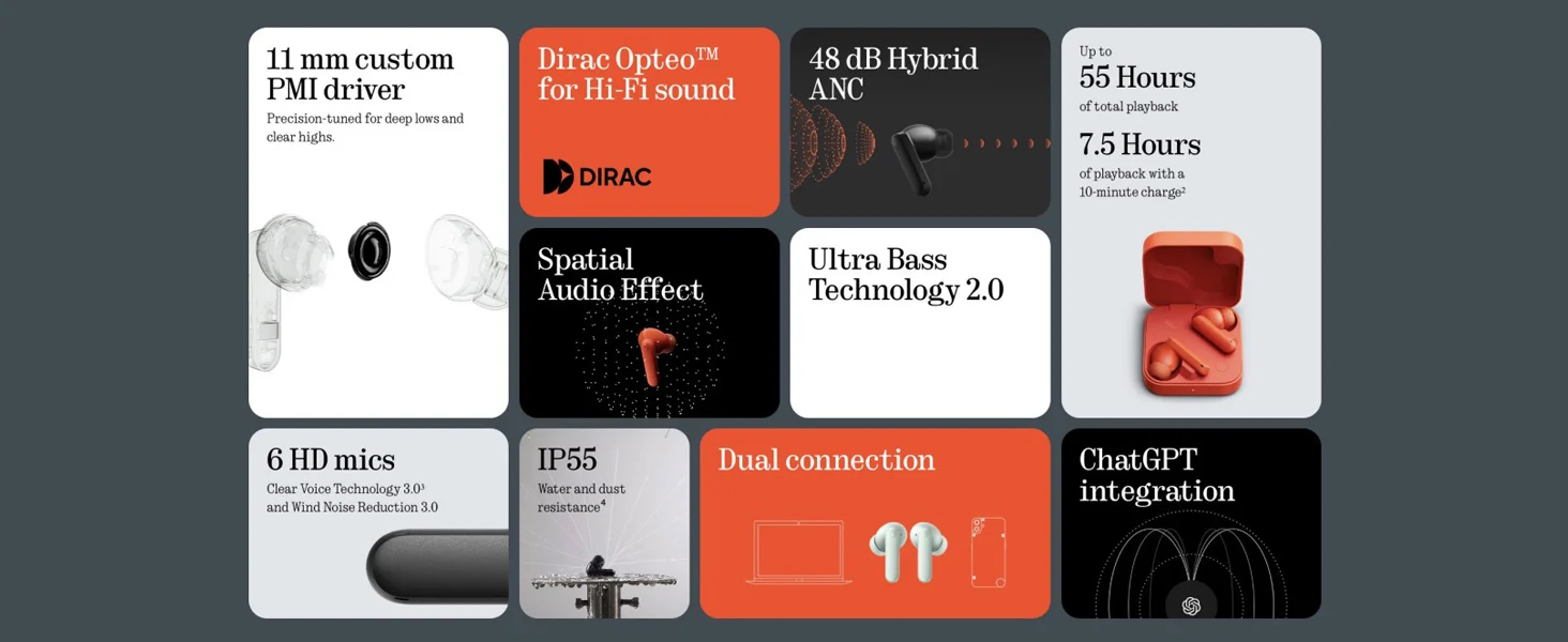 Custom Smart Dial, Hi-Fi dual drivers, 50 dB ANC, 43-hour playback, IP55 water-resistant.
